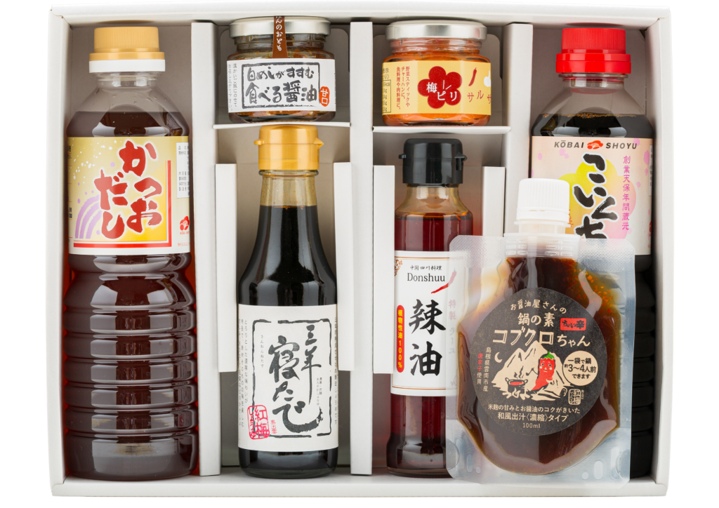 こいくち500ml、かつおだし500ml、三年寝たで、中華料理店「呑舟」監修 ラー油、コブクロちゃん、梅ピリサルサ、 食べる醤油(ピリ辛)